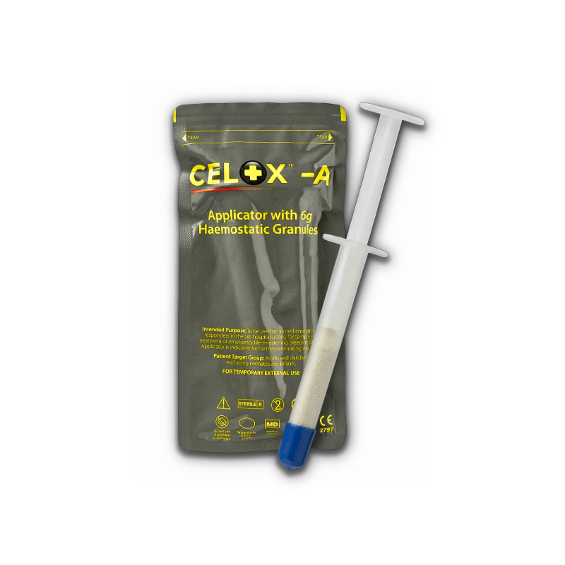 Celox A Applicator is a haemostatic applicator designed to deliver Celox granules directly into penetrating or hard-to-reach wounds to help control severe bleeding. The applicator allows targeted application, making it suitable for emergency response, trauma care, and first aid situations where rapid haemorrhage control is critical.