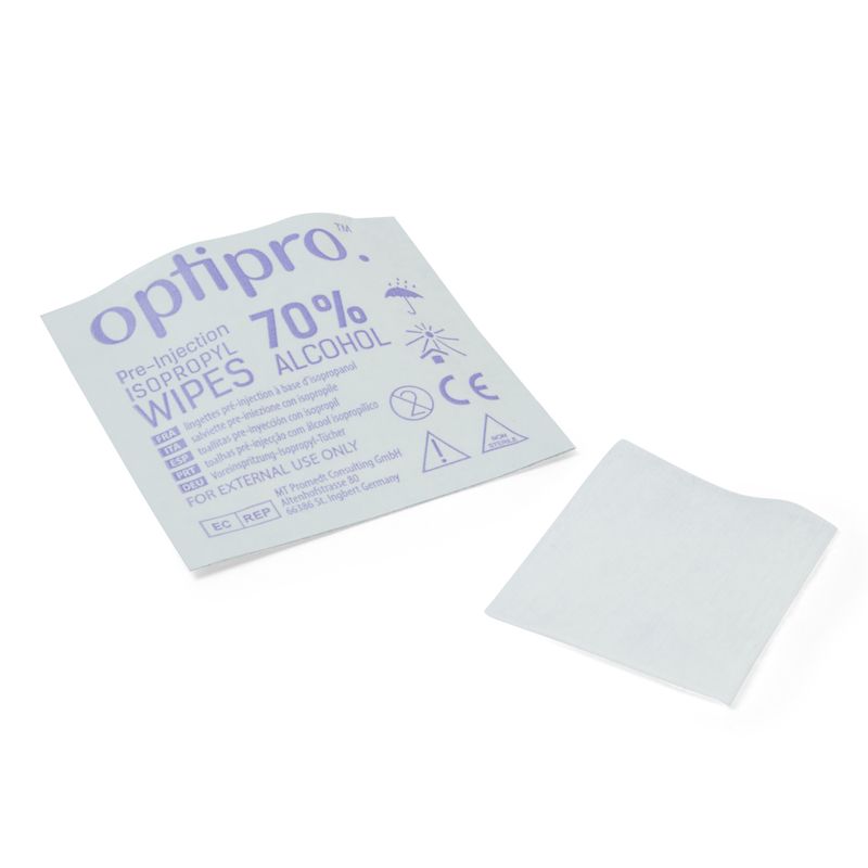 100 Individually wrapped Pre-injection wipes used for skin cleansing before injection. These Non-woven wipes are saturated with 70% Isopropyl alcohol.